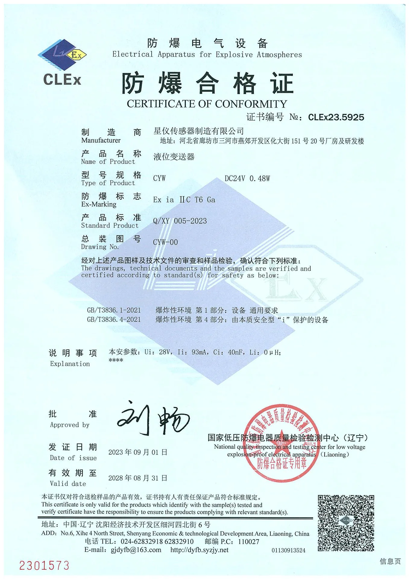 | 防爆类型 | 本质安全型 Ex ia ⅡC T6 Ga (仅限4~20mA输出) |